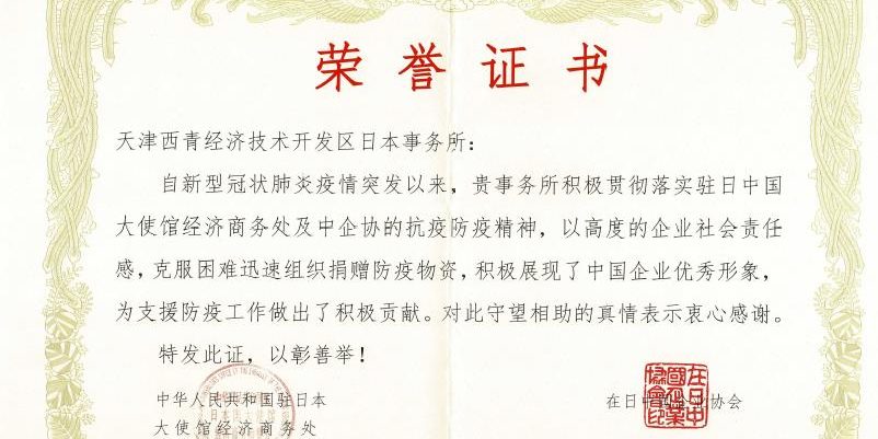 西青開発区日本事務所は天津市民及び在日華僑華人から募金して、3月初めごろに日本NPO法人PEACE WINDS JAPAN日本マスク48000枚を寄付した。寄付したマスクは3月23日に当NPO法人倉庫に到着し、順次に老人ホーム等に配布した。他にも病院や医療関係者にもマスクなど寄付しました。